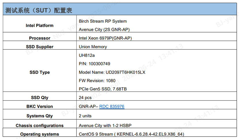 以下是本次忆联UH812a在Intel Birch Stream平台上进行性能测试的相关配置详情。
