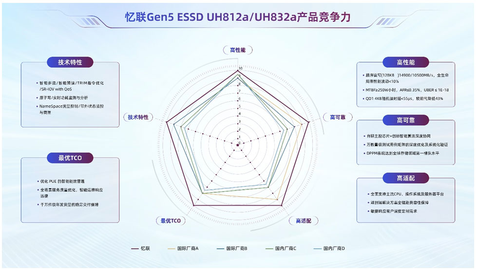 近日,忆联新一代 PCIe 5.0 企业级 SSD UH812a 成功通过英特尔数据中心与人工智能事业部(DCAI)中国区关键组件验证计划的性能基准测试,成为首家通过该验证的国产存储厂商。测试结果显示,UH812a 在关键性能指标上显著领先于同代际主流竞品,其卓越的性能与稳定性充分释放了 PCIe Gen5 高速总线及平台内存带宽潜力,同时有力印证了忆联与英特尔在数据中心存储领域的深度合作成果。