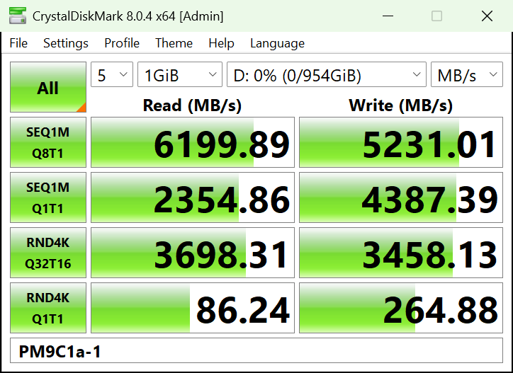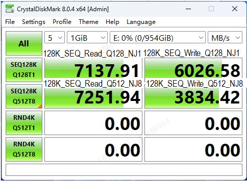 在CDM的严苛测试考验之下,AM541 1TB版本的固态硬盘表现优秀,其连续顺序读取速度达到7143MB/s,超出了产品规格宣称的7000MB/s;而连续顺序写入速度达到了6037MB/s,也超过了产品规格宣称的5600MB/s。而随机读写的IOPS分别达到了988k(3954MB/s)和878k(3512MB/s),远超过了产品规格宣称的800k。CDM的实测结果表现了该款产品对消费级客户在参数指标上的诚意满满。
