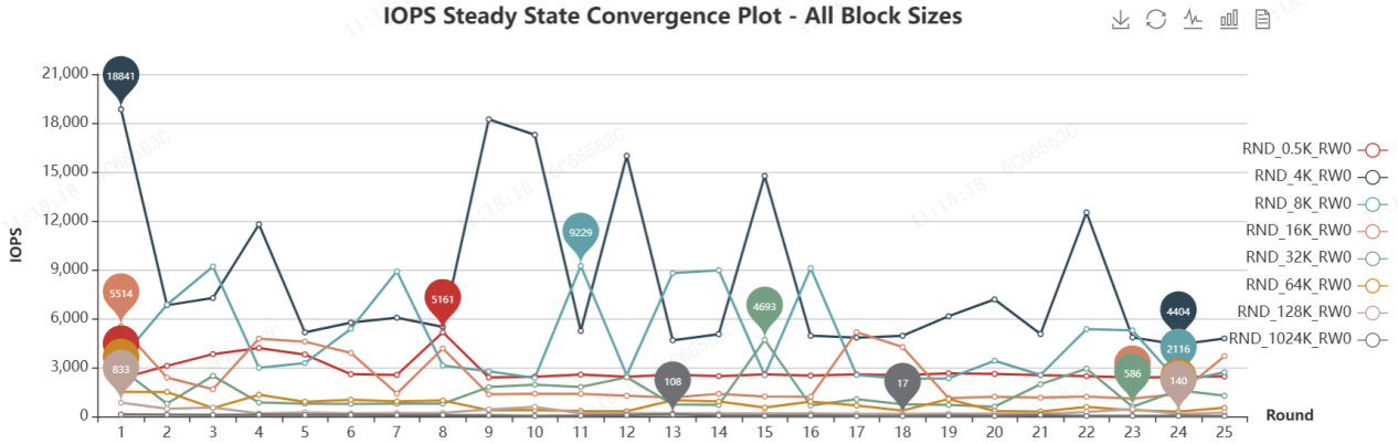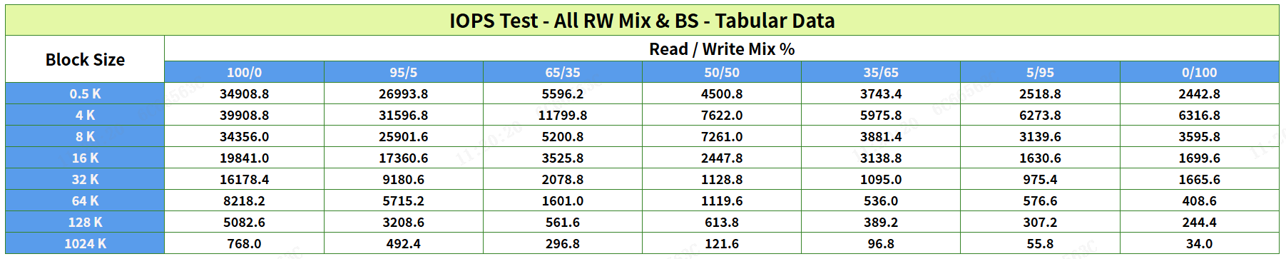 SNIA IOPS测试用于评估SSD的随机读写性能,覆盖了多种读/写混合比例(RW Mix)和块大小(Block Size, BS)的组合。IOPS测试总体信息如下:
