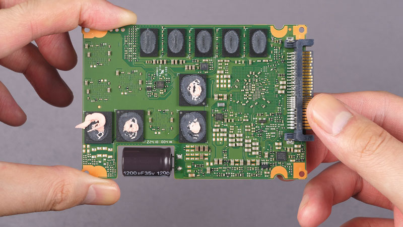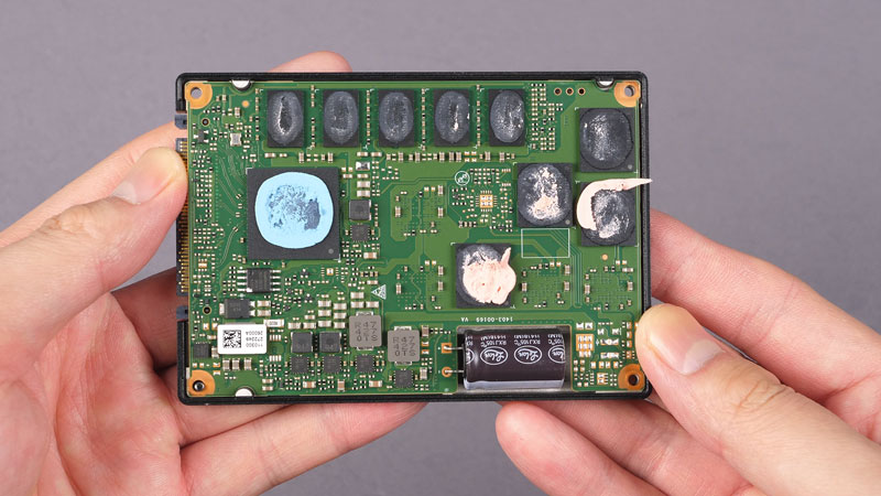 忆联UH812a提供了U.2和E3.S 1T两种形态,本次我们测试的是U.2版本。拆开SSD外壳可以看到位于下图右下方的储能电容,它为确保将DRAM缓存内的数据在异常掉电时100%写入到闪存当中提供电能。而消费级的掉电保护通常就比较简单,只需确保SSD不变砖,而无法保证数据的完整性。
