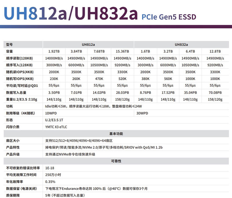 以下是UH812a/UH832a的规格参数,本次我们测试的是UH812a 7.68TB。