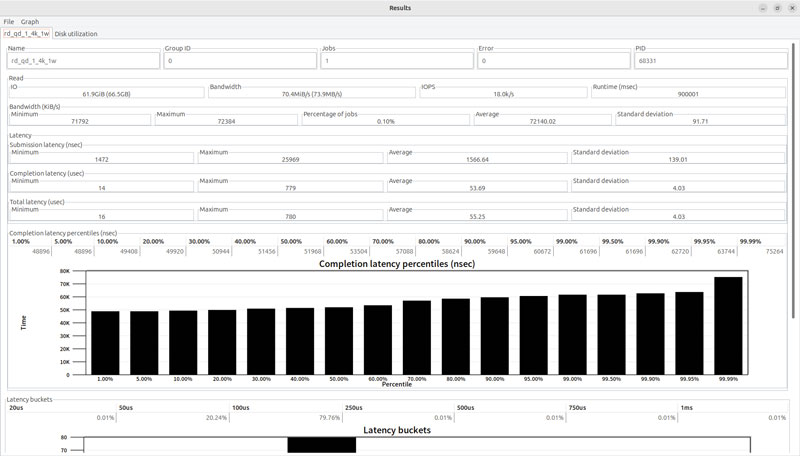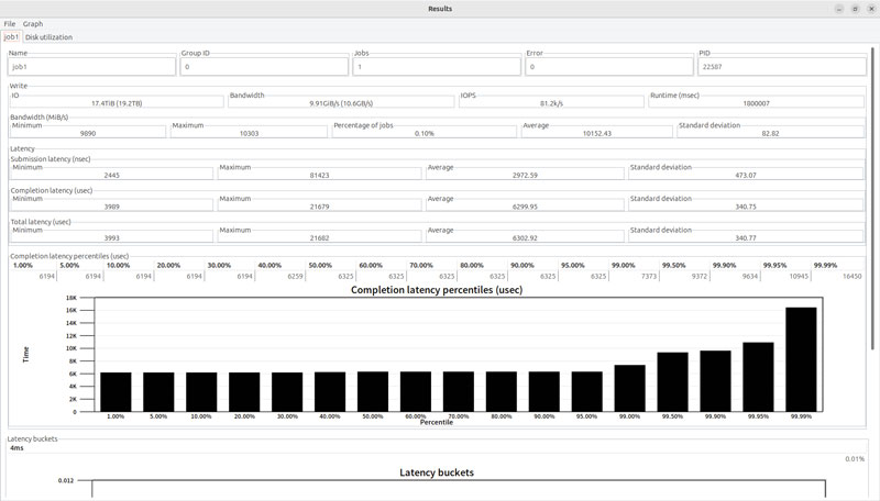 Fio是一款功能强大的存储性能测试软件,gfio为其添加了图形化界面方便使用。用户依然需要通过文本编辑器写好测试配置文件,然后通过gfio加载。测试过程中gfio会每秒刷新显示传输带宽和IOPS数值。测试首先从预处理填盘开始,使用128KB QD512顺序填盘两次。