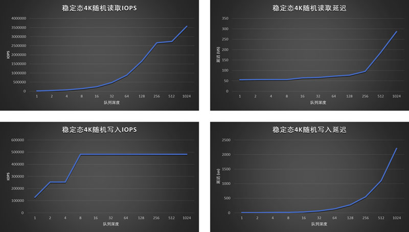 4K随机读取实测3568K IOPS,4K随机写入实测475K IOPS,均达到并超出标称值。