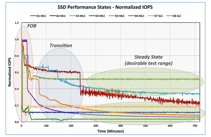 通常,基于NAND闪存的SSD在FOB(Fresh-Out-of-the-Box)阶段以及格式化之后,由于NAND中并没有有效的用户数据填充,因此在写入时并不需要执行垃圾回收动作,致使SSD性能偏高。随着SSD的继续使用,NAND会逐渐被有效的用户数据和无效数据填满,致使在新的写入操作发生时,需先执行GC,导致SSD写性能下降并最终达到一个稳定状态。