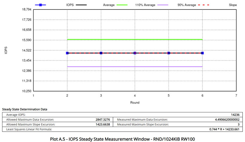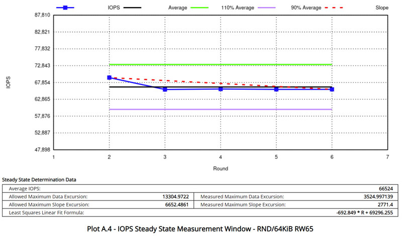 稳态的判定方式为:检查测试窗口中的4K随机写入、64K R65:W35混合随机读写和1024K随机读三项成绩,允许波动范围+/-10%,如连续5轮均符合要求,则判定SSD已经进入稳态。