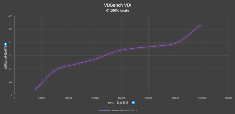 Virtual Desktop Infrastructure测试数据模型中,读写混合比例为59.48:40.52。4K、16K、32K和64K读取分别占比39.35%、16.47%、10.37%和12.86%,随机存取占比80%。4K和8K写入分别占比61.11%和13.05%,随机存取占比80%。Dedupratio=7,Compratio=8。在这个环节中忆联UH812a 7.68TB的峰值IOPS达到348K IOPS,表现令人满意。