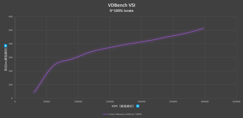 Virtual Storage Infrastructure测试数据模型中,读写混合比例为57.4:42.6。4K、8K、60K读取占比分别为25.68%、26.31%和10.52%,随机存取占比80%。4K和8K随机写入占比分别为59.62%和14.81%,随机存取占比80%。这个测试中忆联UH812a 7.68TB的峰值IOPS为298K IOPS,满足多样化工作负载和应用对存储性能的需求。