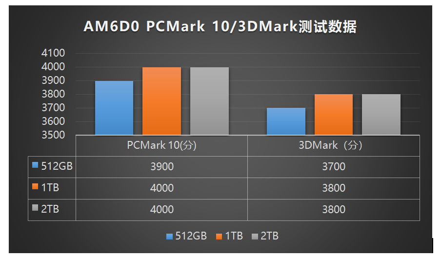 在模拟真实办公与创作环境的PCMark 10测试中,AM6D0 1TB/2TB版本均突破4000分大关;在与游戏体验高相关的3DMark测试中,三个容量点的得分均超过3700分,充分印证了AM6D0综合性能的全面领先实力。