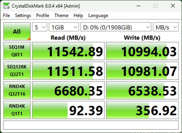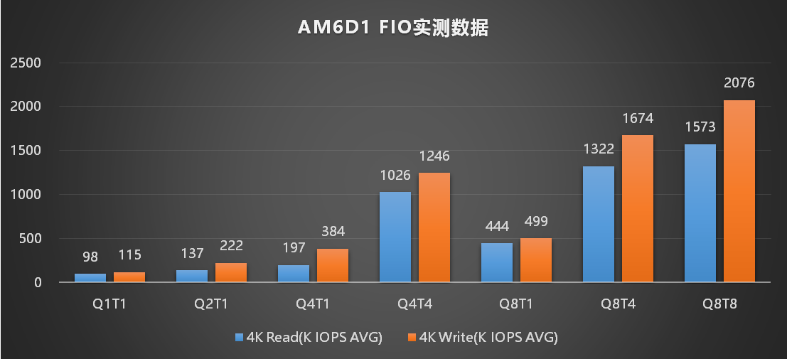 基于对AM6D1 2TB产品的实测评估,结果表明:在CDM、FIO等衡量严苛的底层性能基准测试中, AM6D1凭借出色的表现,成功挖掘并展现了其极限性能潜力。在CDM基准测试中,AM6D1带宽表现亮眼:顺序读写速度分别达到11500MB/s和10900MB/s,不仅高于标称性能,且超越PCIe 4.0 8CH有缓产品,充分印证忆联在固件算法与闪存调校上的深厚积累。