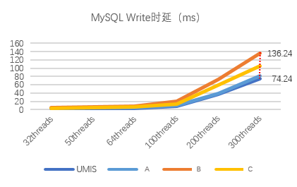 根据图3可知,在MySQL读性能下,忆联SSD在50-100线程之间性能最优,对比友商TPS最大有122%的提升,时延最大有91%的降低。在MySQL只读性能验证环境下,忆联优势表现明显。
