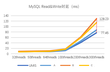 如图4所示,MySQL写场景下,忆联SSD始终保持着明显优势,性能表现强劲。在吞吐量上,对比友商最大有266%的提升;在时延上,最大有83%左右的下降,由此可见,忆联UH8系SSD可助力MySQL只写场景下存储性能的充分发挥。