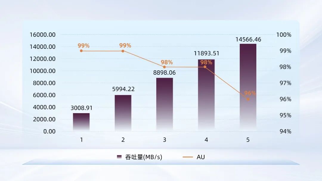 在U-Net3D场景负载下,我们共计训练了42000个文件,模拟了1到5颗GPU的训练过程。如图1所示,UH812a在模拟5颗H100 GPU的负载下,实现了14566.46 MB/s的最高吞吐量,接近标称读带宽(14900 MB/s),此时GPU利用率(AU)达到最低96%,远高于基准所要求的90%以上水平。通过图1也可看见,UH812a的性能随着GPU数量增加而线性提升,且GPU利用率仅出现微弱波动,证明其在多客户端高并发访问场景下仍能持续提供稳定、高带宽的数据流。