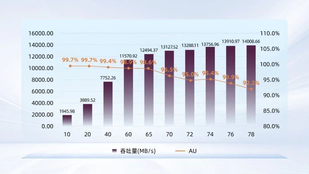 在ResNet-50场景测试中,我们共计训练了19163个文件,模拟了10至78颗GPU的训练过程。如图3所示,在模拟78颗H100 GPU的负载下,UH812a实现了14008.66 MB/s的最大吞吐量,GPU利用率稳定在92.2%,同样超过基准要求(AU> 90%),体现出其能够为复杂训练任务持续提供充足的存储性能支持。