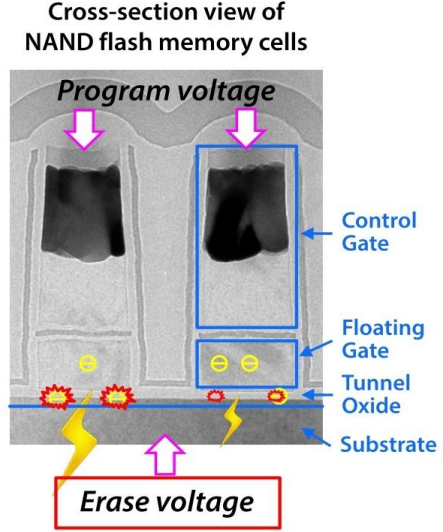 耐久度表征NAND Flash能够承受的反复擦写次数。NAND Flash的擦写次数是有限的,因为每次擦写操作都会对介质造成损伤。如下图所示,进行擦写操作时,会用十几伏特的高电压对晶体管进行充放电操作,当高能电子来回的穿越绝缘层,就会给绝缘层带来物理损伤,最终影响数据可靠性。