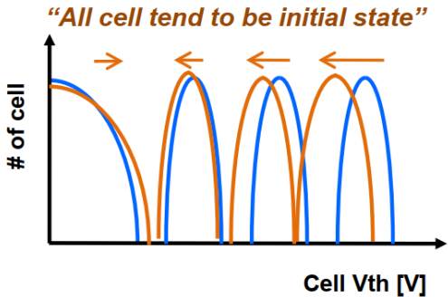 随着时间流逝,受量子隧穿效应影响,编程操作充进去的电子会随机发生电子逃逸,进而影响存储的信息。如下图所示,编程操作后的电荷分布如蓝色线所示,Retention后电荷分布向左偏移,影响数据的正确读取。