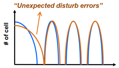受闪存阵列结构影响,我们去读一个Page时,要对其他位置上的非读page也施加一个电压,造成读干扰效应。读次数较少时,读干扰影响不明显,但是当次数增加到几千次时,累积的弱编程的效应也会影响数据可靠性。如下图所示,较低的电荷状态更容易受到干扰。