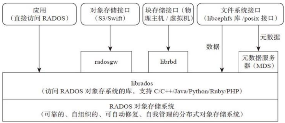 Ceph 主要分为应用接口层、存储基础接口层、存储对象层。接口层主要负责客户端访问,分为本地语言绑定接口、块存储设备接口和文件系统接口,展现了 Ceph 统一性。