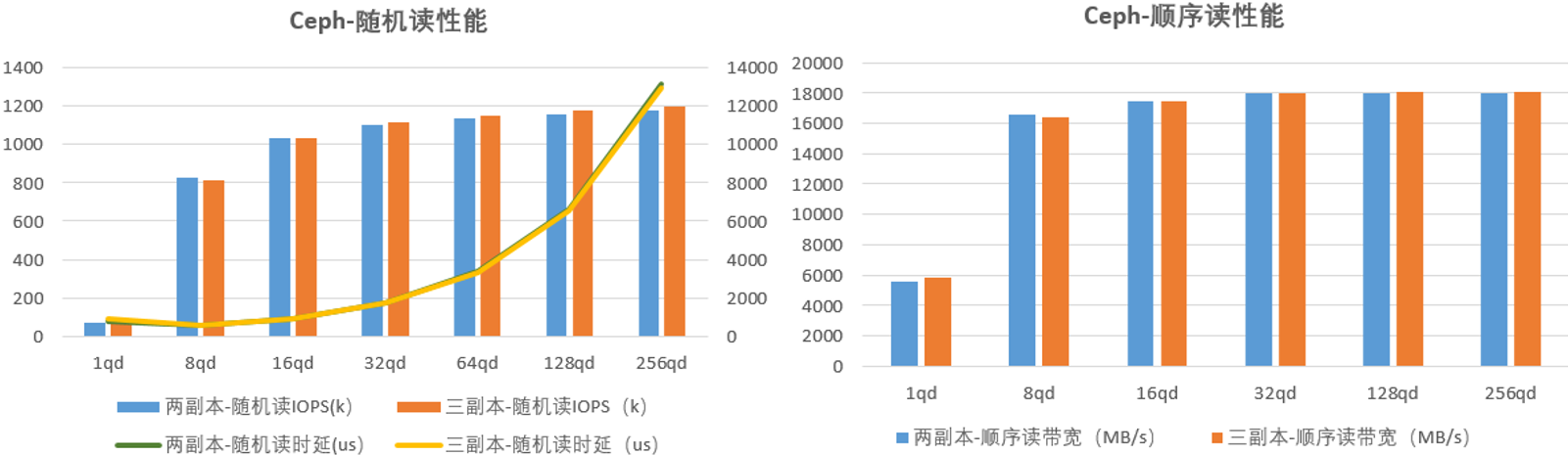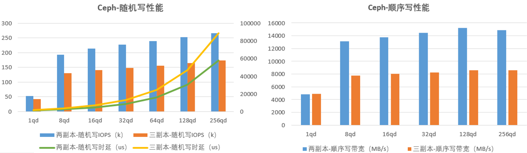 如图 5 所示,不论是在随机写还是在顺序写业务下,二副本写性能远高于三副本性能,主要是由于副本复制带来的网络及存储开销,造成三副本写带宽及写 IOPS 下降明显。在总体时延表现上,二副本明显优于三副本。在时延变化趋势上,二副本与三副本基本一致,皆在 32QD 后有比较显著的上升。