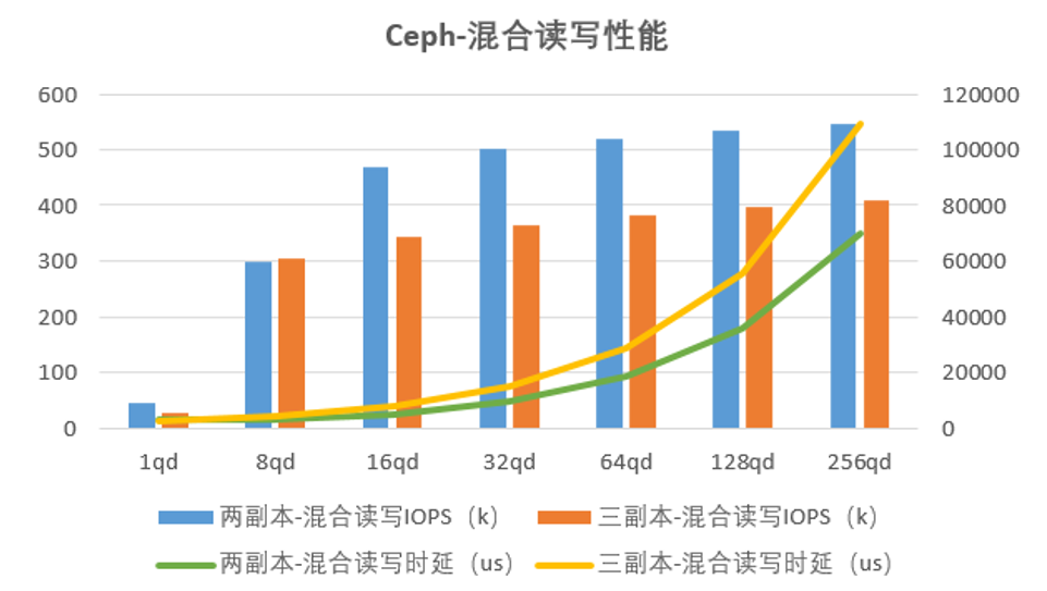 从图 6 可以看出,在 4K 7:3 混合读写业务场景下,从 16QD 起,二副本 IOPS 性能优于三副本。在时延整体表现上,二副本低于三副本,但在时延变化趋势上,二副本与三副本基本一致,时延从 32QD 起,明显上升。