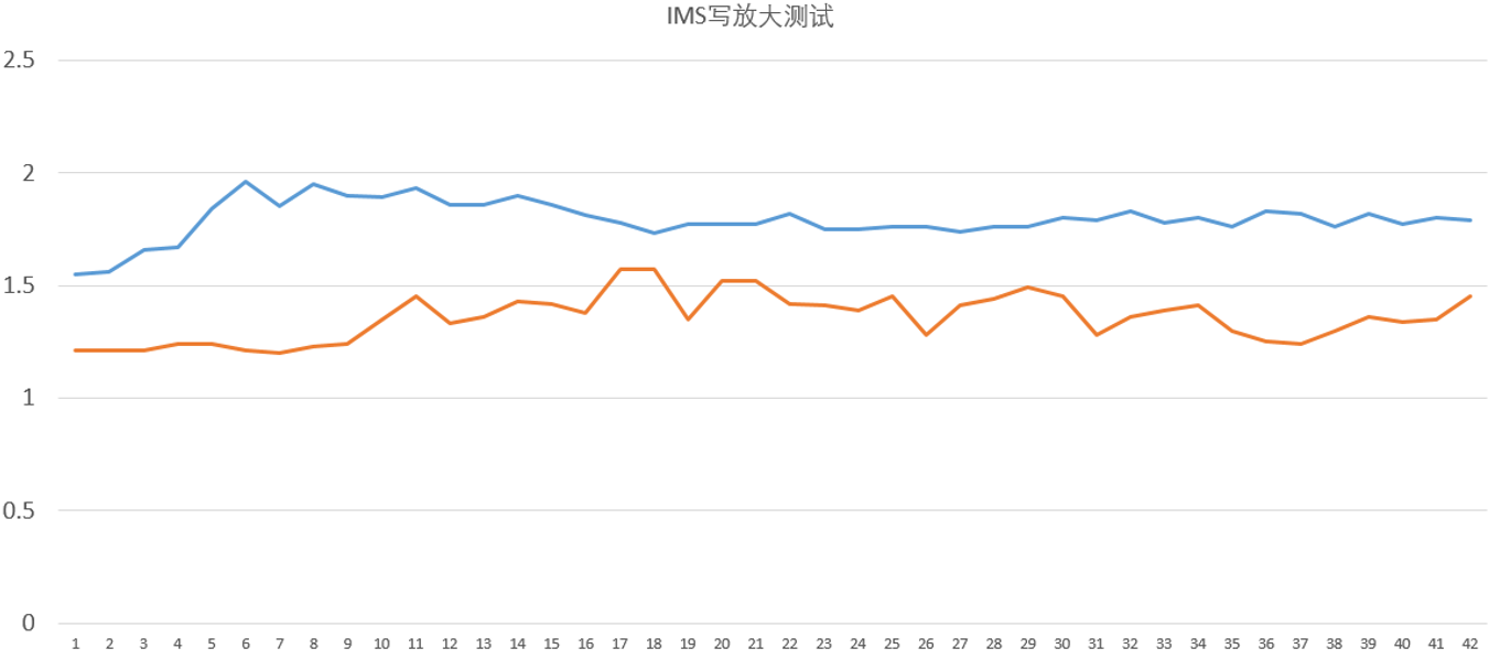 在 Ceph 方案中,基于标准 JESD 219 业务模型,针对 SSD 分别开启、关闭智能多流进行写放大测试,通过图 7 对比验证结果可以看到忆联智能多流(IMS)开启后,SSD 写放大降低 20%+,极大提升了 SSD 寿命。