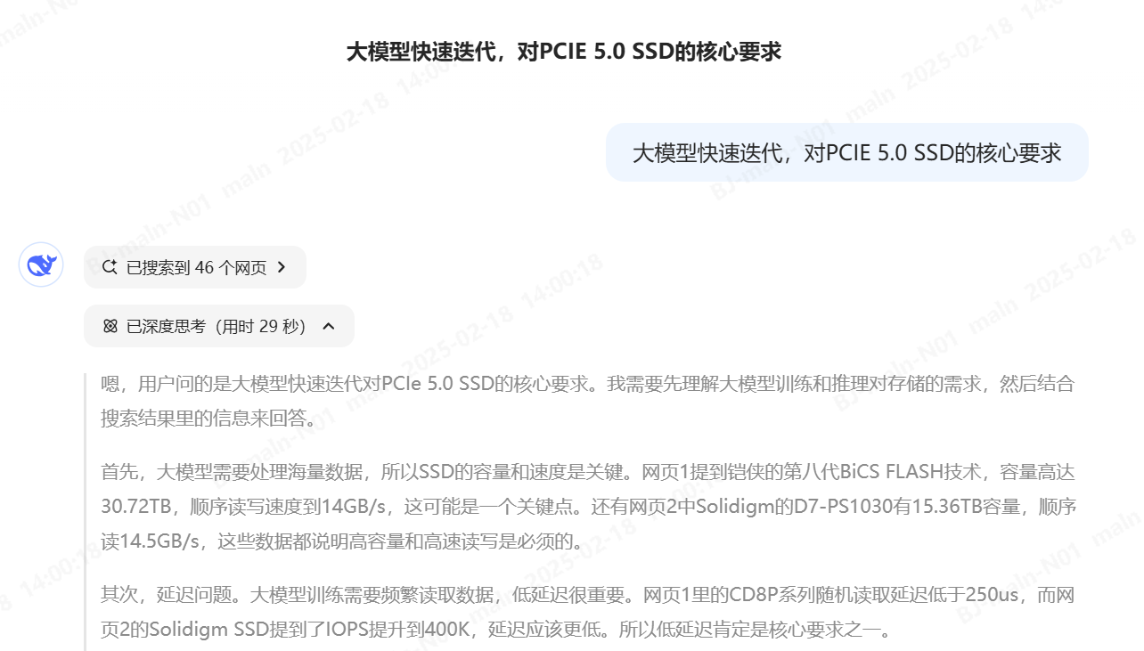 我们借助DeepSeek深度思考和联网搜索能力将“大模型快速迭代,对PCIe 5.0 SSD的核心需求是什么”输入给DeepSeek后,它给出如下回复:“大模型的快速迭代对存储系统提出了更高要求,尤其是PCIe 5.0 SSD作为关键数据载体,需在读写性能、延迟、容量、可靠性等多维度全面突破,才能支撑大模型训练/推理的实时性需求。”