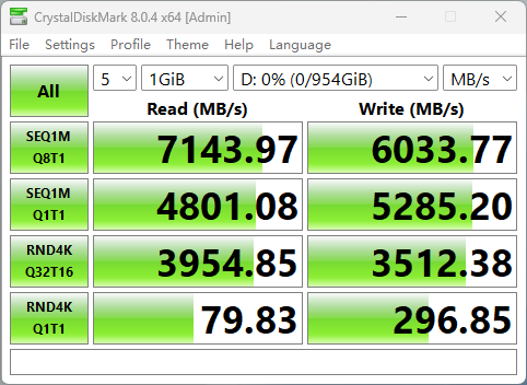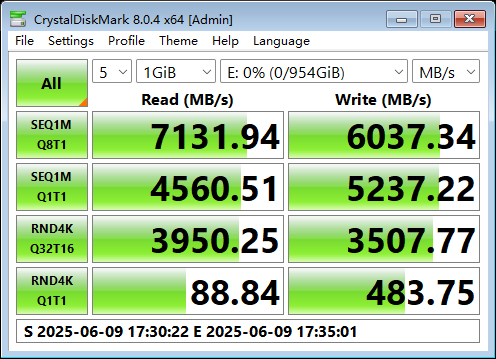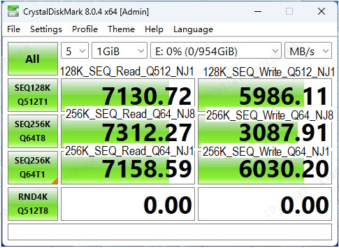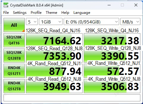 在CDM的严苛测试考验之下,AM541 1TB版本的固态硬盘表现优秀,其连续顺序读取速度达到7143MB/s,超出了产品规格宣称的7000MB/s;而连续顺序写入速度达到了6037MB/s,也超过了产品规格宣称的5600MB/s。而随机读写的IOPS分别达到了988k(3954MB/s)和878k(3512MB/s),远超过了产品规格宣称的800k。CDM的实测结果表现了该款产品对消费级客户在参数指标上的诚意满满。