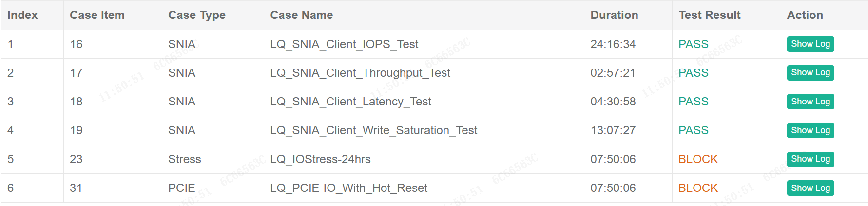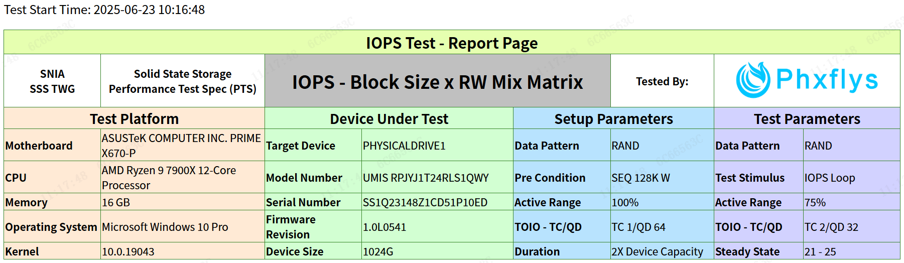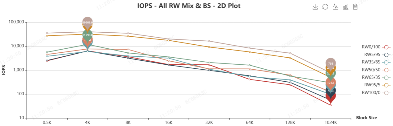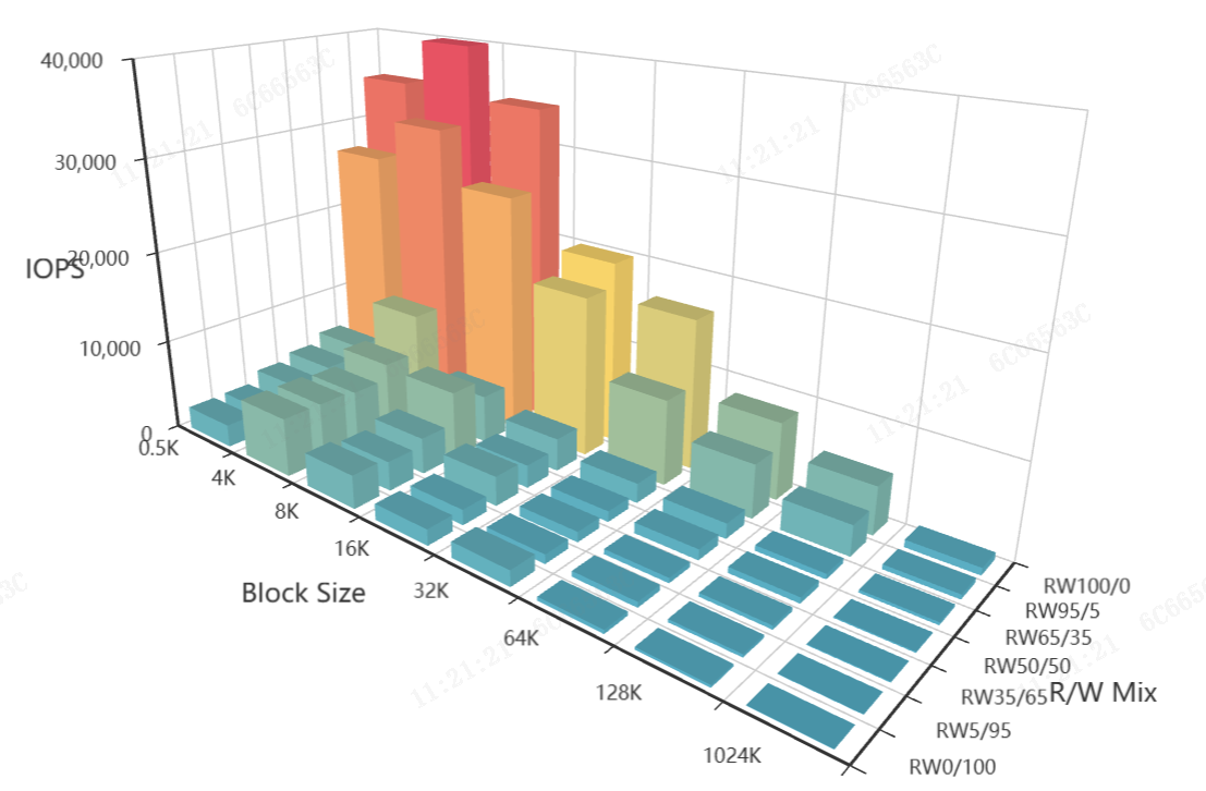 SNIA IOPS测试用于评估SSD的随机读写性能,覆盖了多种读/写混合比例(RW Mix)和块大小(Block Size, BS)的组合。IOPS测试总体信息如下: