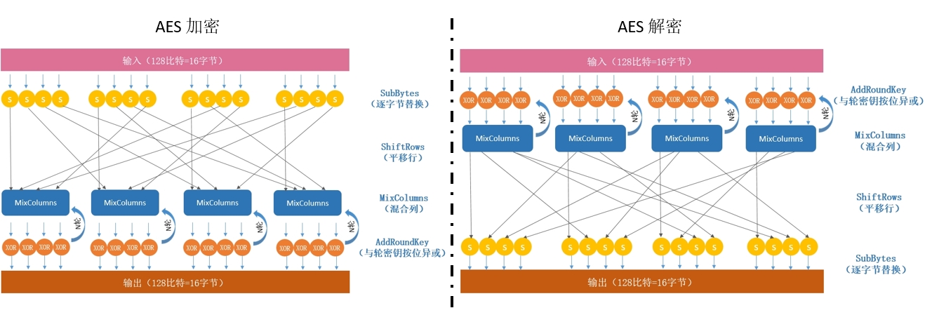 ·AES算法加密流程:因此流程较为复杂不做过多展开,大致流程为输入的明文数据会逐字节的去替换,替换完成后再平移,平移完成后再做混合列的N轮迭代,最后进行异或运算生成密文。解密则是反向操作。