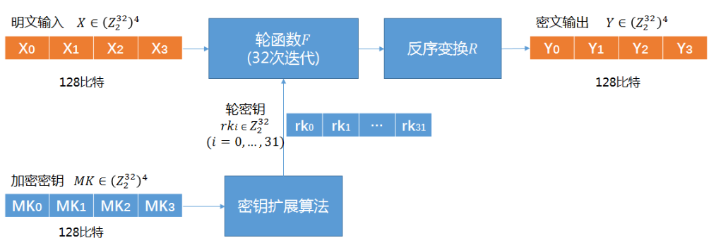 ·SM4算法加密流程:SM4是一种分组密码算法,其分组长度为128位(即16字节,4字),密钥长度也为128位(即16字节,4字)。其加解密过程采用了32轮迭代机制(与DES、AES类似),每一轮需要一个轮密钥(与DES、AES类似),以及1次反序变换。