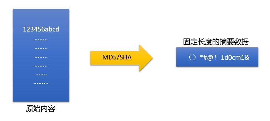 ·非对称加密算法(消息摘要)-MD5/SHA:用于文件校验、文件的数字签名(保障原始明文在数据传输与明文传输过程中的正确性),文件内容可以是明文。如图所示是无法从摘要推倒出原文的,经常用于网络上的文件传输校验。
