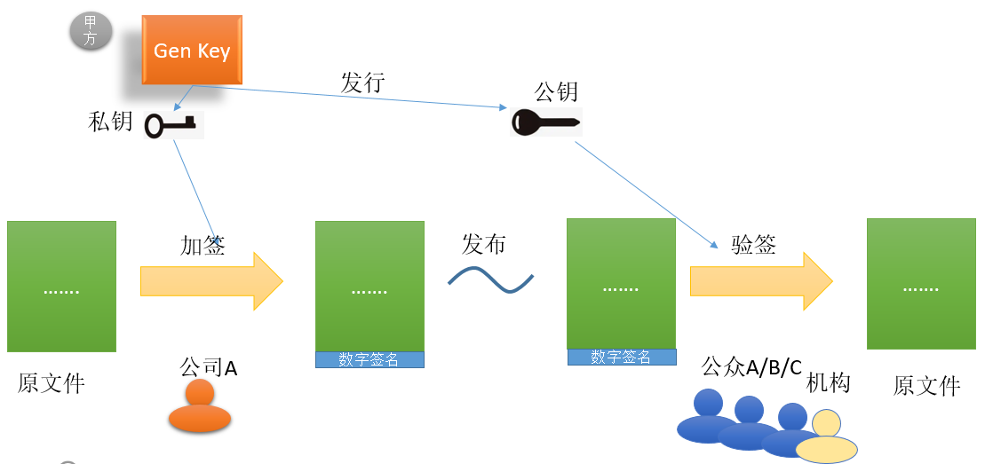 举例1:公司A要发布一个公众文件(如驱动),生成了公钥和私钥,首先用私钥进行加密签名,以此来证明产品归公司A所有并以此证明产品安全合法,用户下载驱动文件后可用公钥解验签后(类似微软会提示这是一个驱动是否是合法的签名驱动)进行正常使用。