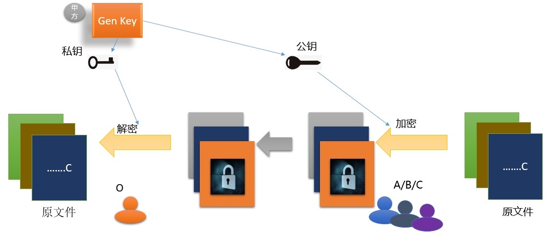 举例2: A/B/C要各自发私信给O,但又不想各自的信息给其它两人看见,就用O给他们的公钥加密,由于其它两人没有私钥无法解密,只能O看见A的高密。