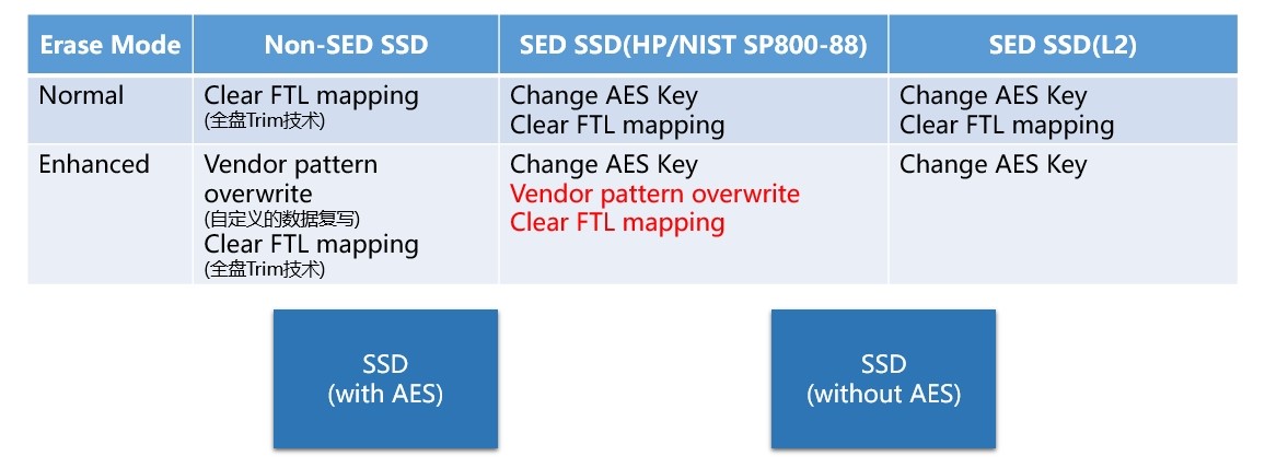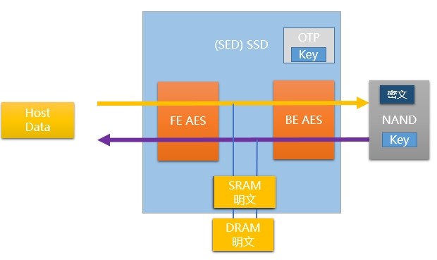 在SSD内部有一个AES硬件模块,用于主机数据或内部数据的加解密,它的Key由SSD的固件来管理,保存在NAND上或SOC内部的OTP区域,根据IEEE 1667规范,这种SSD内部有加密模块称之为SED(Self-encrypting) SSD,其它的则非Non-SED SSD。