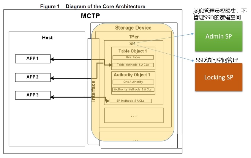 如图中所示,在SSD上方有两块SP:Admin SP和Locking SP,Admin SP类似管理员权限集,只有一些管理功能,不负责SSD的逻辑空间的分配或决策;Locking SP即SSD访问空间管理。