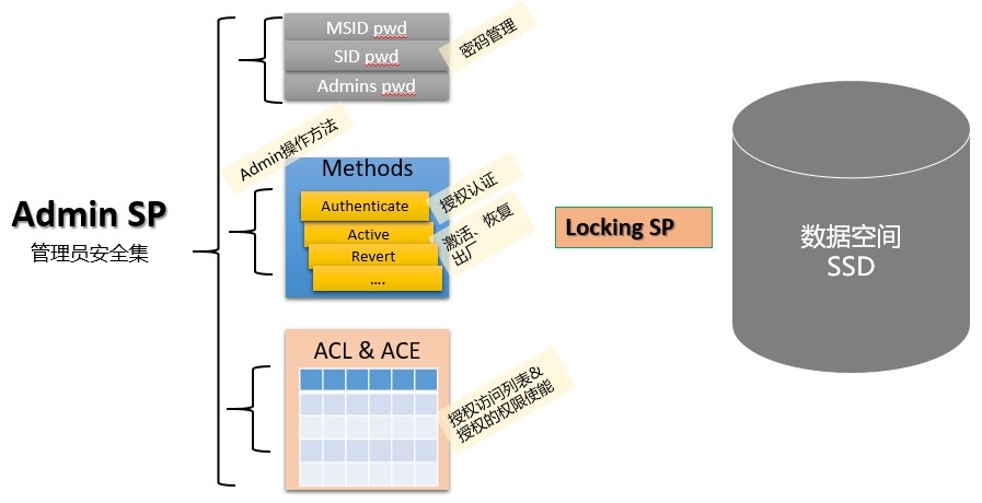 其中最主要的是Admin SP,用于密码管理,使能/禁止Locking SP,恢复出厂设置等,Admin SP不直接对SSD的数据空间进行管理,一般用于密码管理,多达几十种。