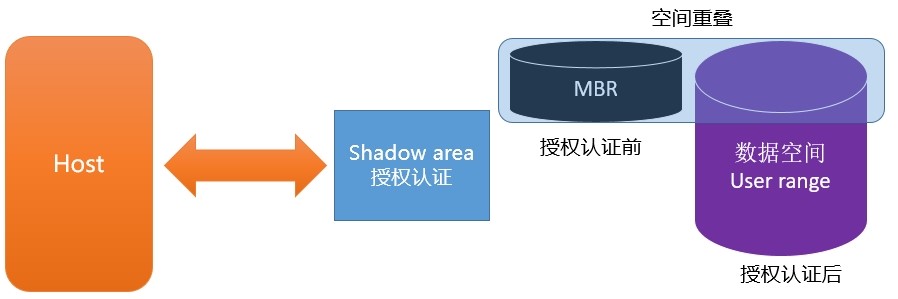 此MBR不是OS中的Master boot record,TCG中的MBR与User空间是重叠的,同一时间内只有一个对Host可见,在SSD没有被完全授权前,真实的User数据空间是无法被访问的,对Host显示的仅为一小块空间,这里面存放一些Preboot的认证程序、数据,认证通过后会切换到真实的User数据空间。