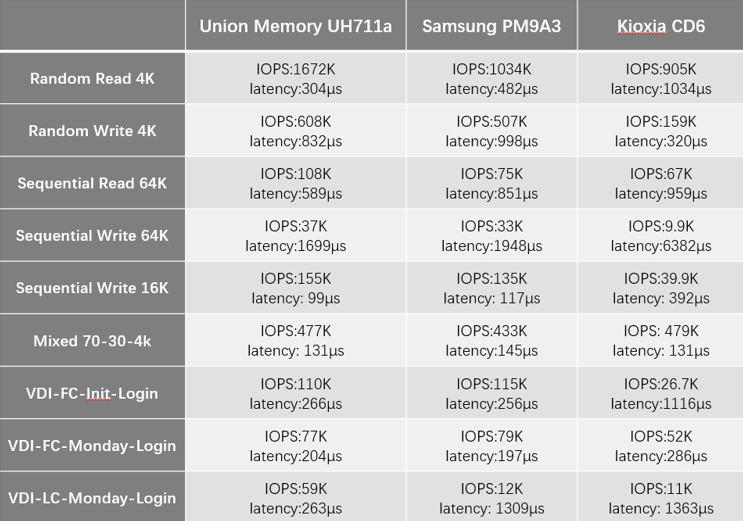 近日,StorageReview发布最新评测报告,将Union Memory UH711a与Samsung PM9A3、Kioxia CD6进行了比较测试。报告显示,UH711a在4K随机读写以及70%读取/30%写入4K的IOPS性能表现出色。在VDI完整和链接克隆测试中,保持了领先优势。总的来说,UH711a性能可充分满足数据中心的主流工作负载和应用。