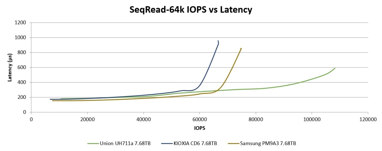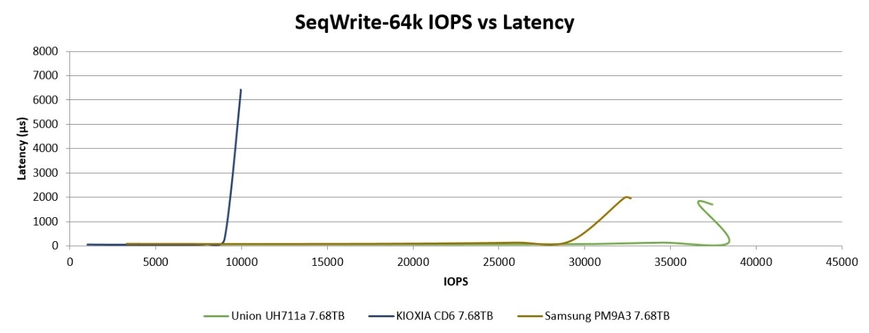 顺序64K写测试中,UH711a排名第一,最好的成绩是37K IOPS与1699µs延时。