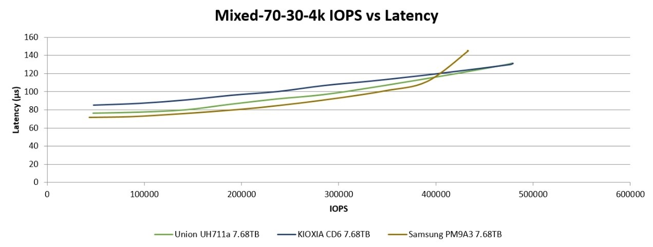 在混合读/写配置文件测试(70-30-4k)中,UH711a没有出现延迟峰值,以477K IOPS的峰值和131μs的延时结束。