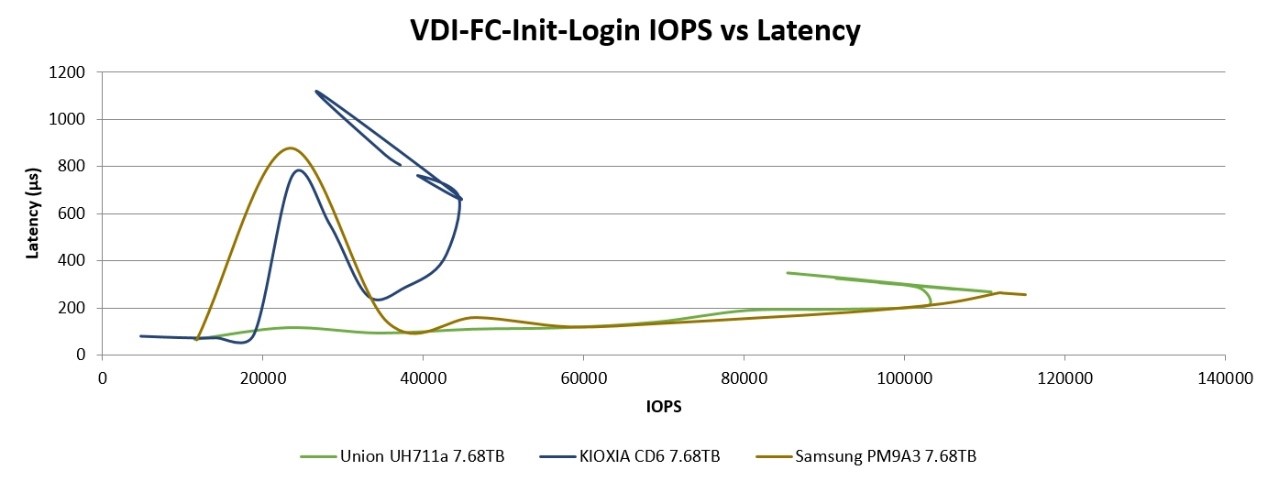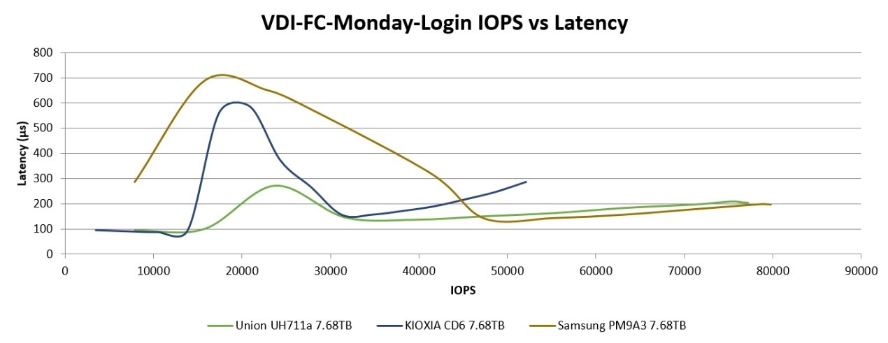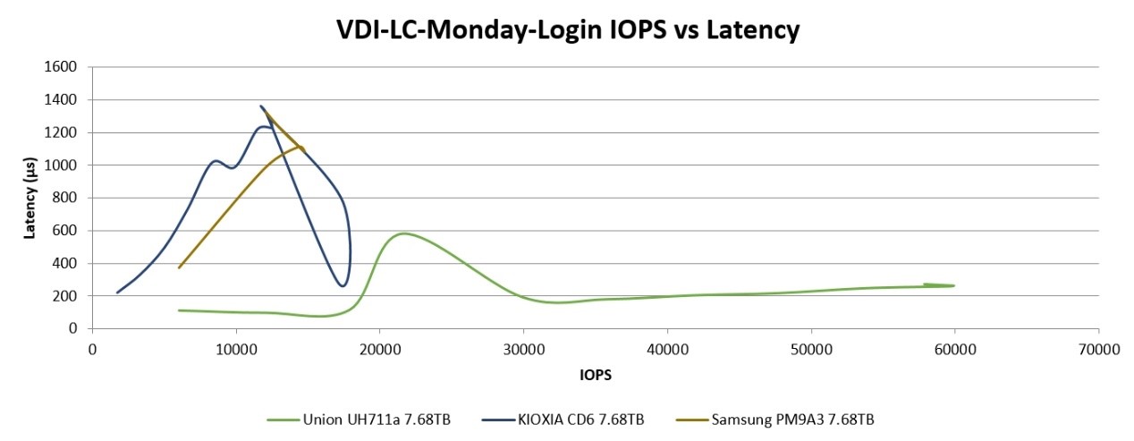 在VDI-LC-Monday-Login场景中,UH711a表现出更平稳的性能,保持了相对较低的延迟,以59K IOPS与263µs的延时完成了测试。