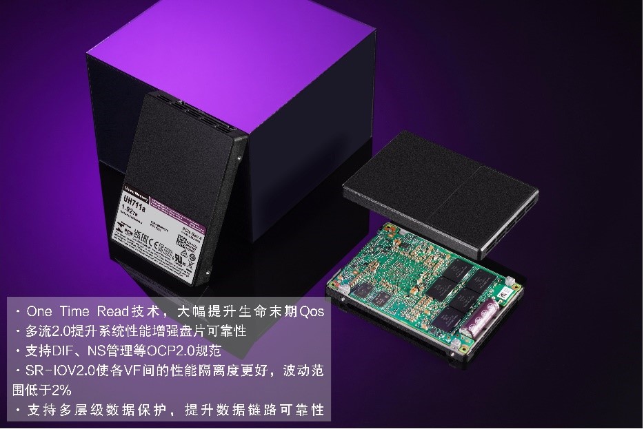 UH711a还支持DIF、NS管理等OCP2.0规范,不仅与系统配合实现端到端的保护,也能在盘内实现独立的端到端的保护机制,确保盘内整个通路的数据安全,从而为数据中心在多种极端场景下的正常运维提供双重保护。