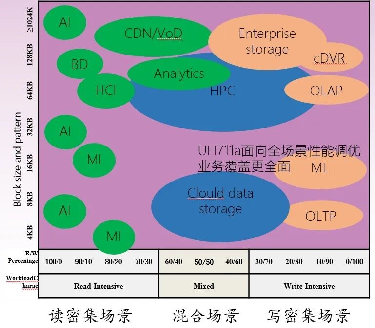 UH711a面向数据中心级的读密集场景、混合场景、写密集场景等业务场景和各类IO pattern,可提供全面的性能、功耗调优。尤其在数据库、块存储、对象存储、海量存储等对随机IOPS性能高要求场景下UH711a的性能显著。