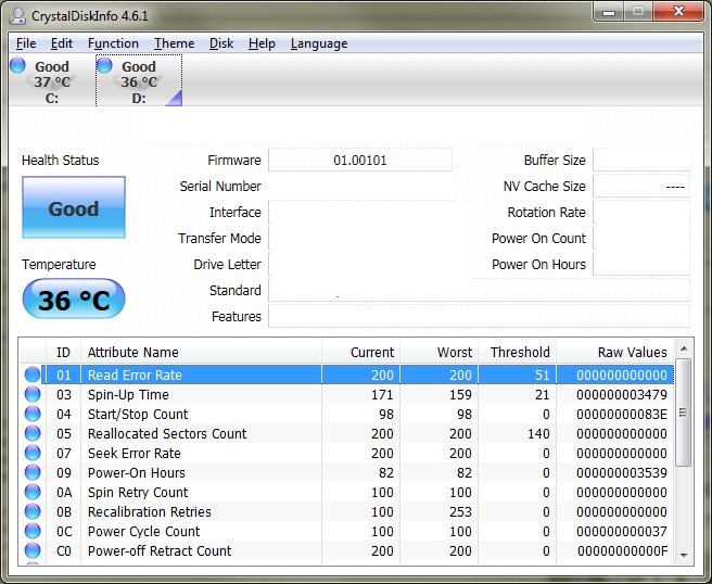 CrystalDiskInfo (以下简称CDI)是检测本机固态硬盘详细信息的工具。与CDM不同的是,CDI是查看固态状态的软件,CDI通过读取S.M.A.R.T了解固态硬盘健康状况:包括接口、转速、温度、使用时间等,软件还会根据S.M.A.R.T的评分做出评估,当固态硬盘即将损坏时还会发出警报。