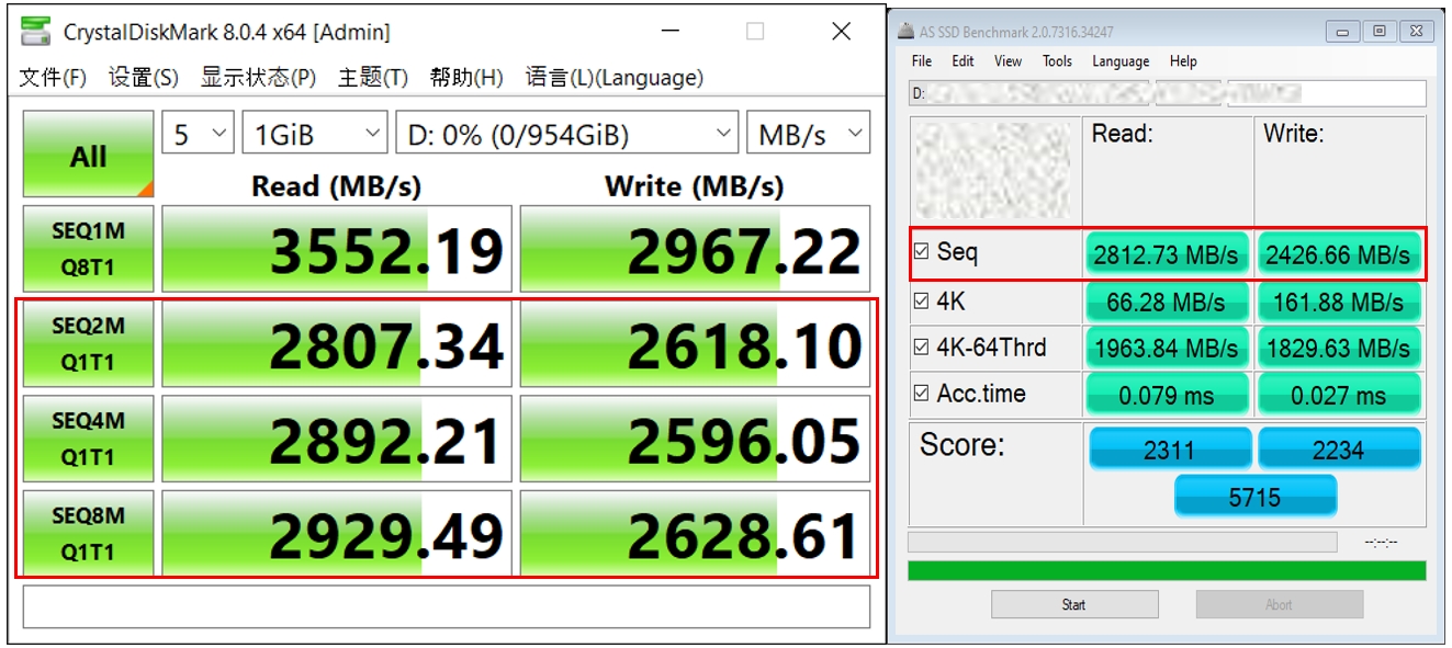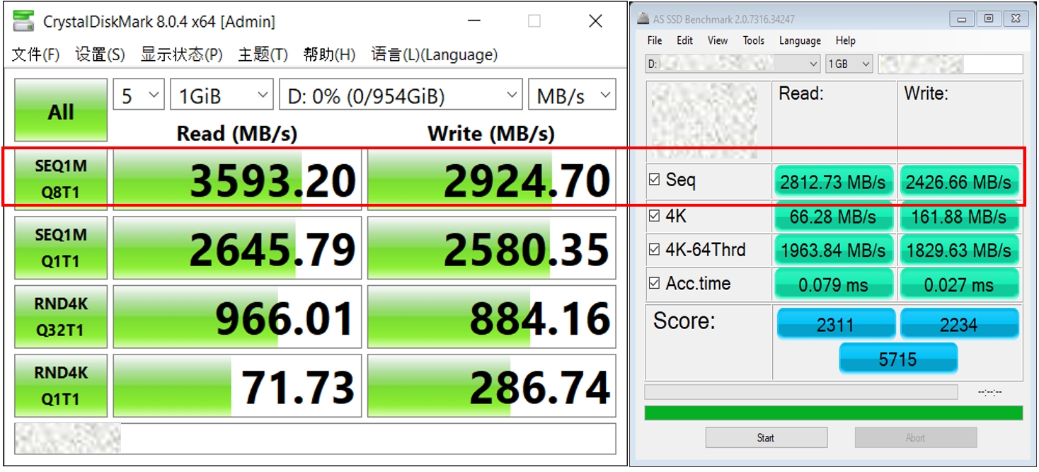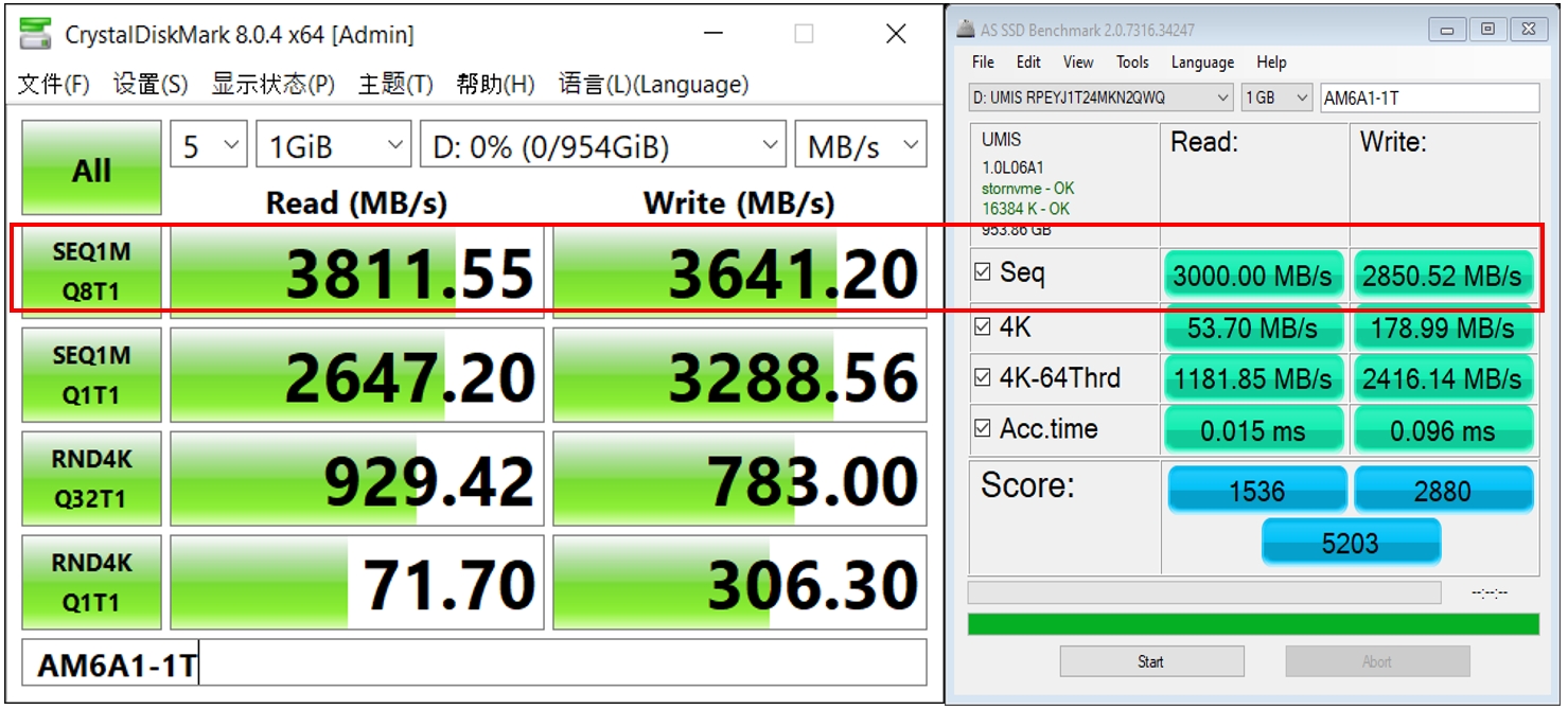 由于每一款测试软件的侧重点不同,测试出的数据也有所差异。以AS SSD和 CDM 为例,并选取忆联 AM6A1 和另一款原厂友商的 NVMe Gen4 1TB 产品作为测试对象,AS SSD 的顺序读写性能和 CDM 测出的顺序读写性能均相差了 1000MB/s 左右。