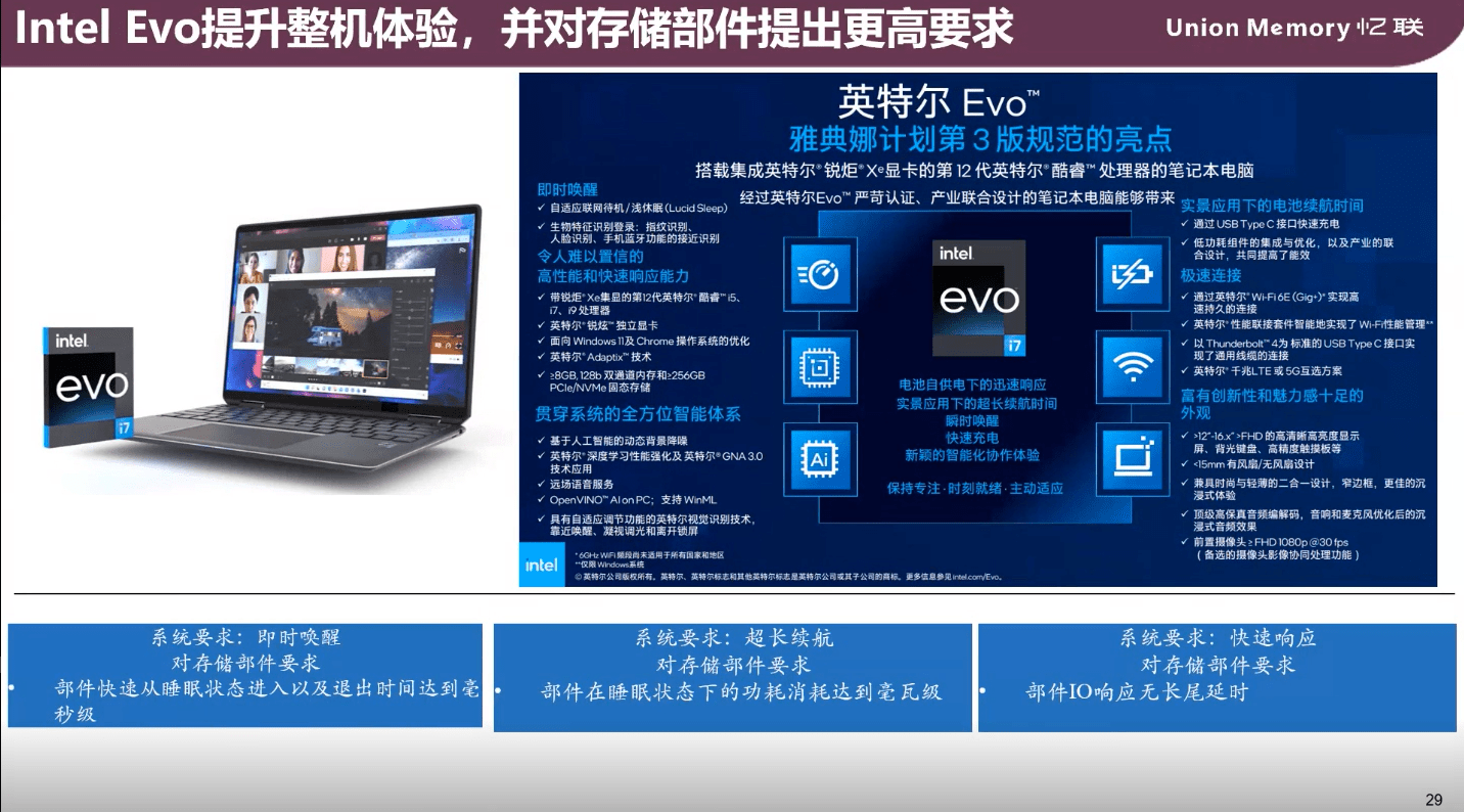 随着英特尔第12代酷睿处理器的发布,更严苛、更细致的Evo 3.0规范随之而来,其中笔记本的响应速度是Evo 3.0认证的重要标准之一,固态硬盘在其中展现出了重要作用,作为国产SSD厂商中的领先者,忆联成为国内首家通过英特尔Evo整机认证的SSD厂商。