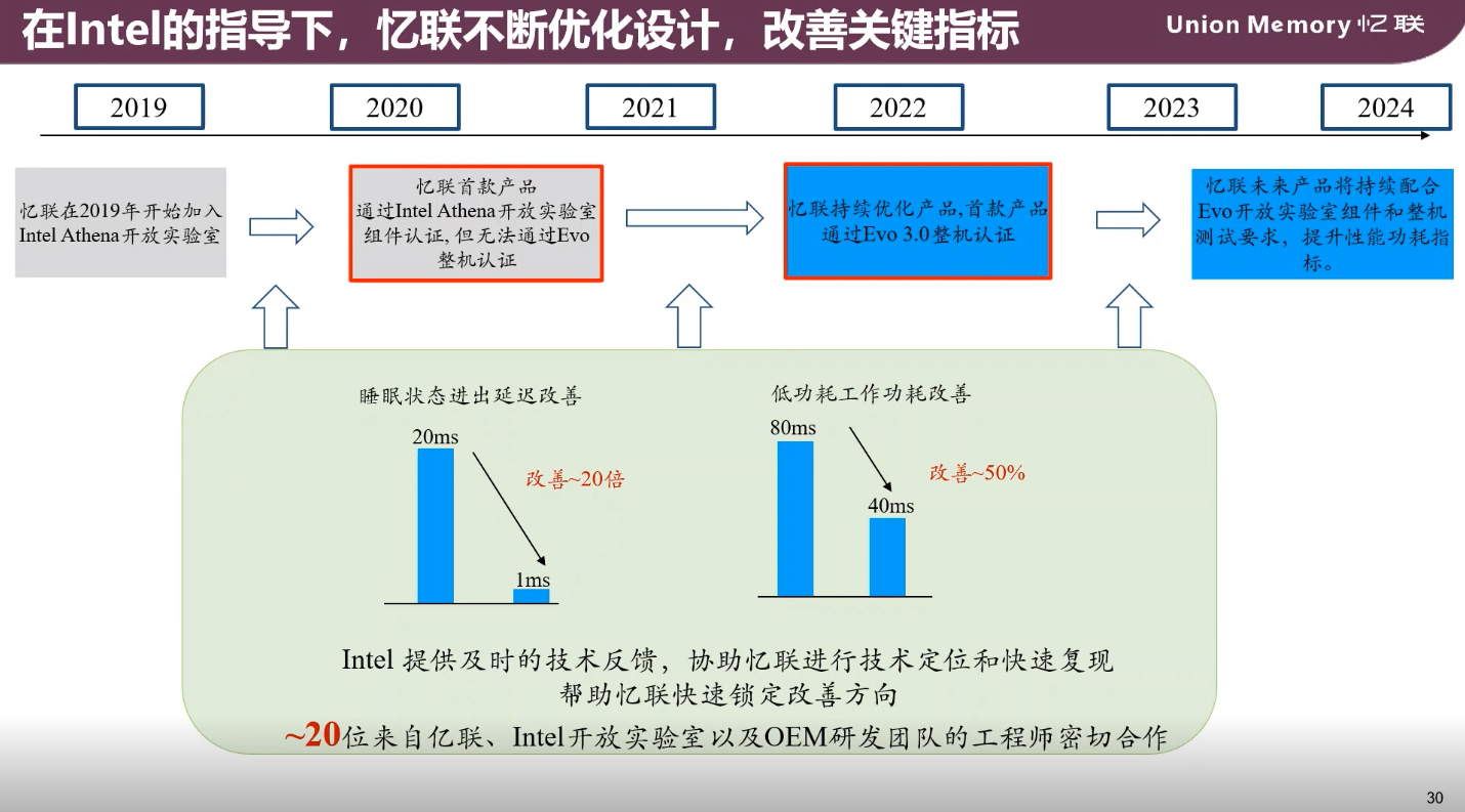 为了达到以上要求,忆联在2019年便加入英特尔雅典娜开放实验室,过去几年里与英特尔保持密切合作。在来自忆联、英特尔开放实验室、OEM研发团队约20位工程师的共同努力下,忆联持续优化迭代产品,将睡眠状态下进出延迟由20ms降低至1ms,响应速度提升了20倍,低功耗则优化了50%,并最终通过了Evo认证。整个过程中英特尔提供了非常及时的技术反馈,协助忆联从技术定位、快速复现,包含在实验室中提供可以区别忆联深度解读的数据来锁定这些改善的方向。目前忆联是国内在PC SSD领域中首家通过英特尔Evo整机认证的存储厂商。