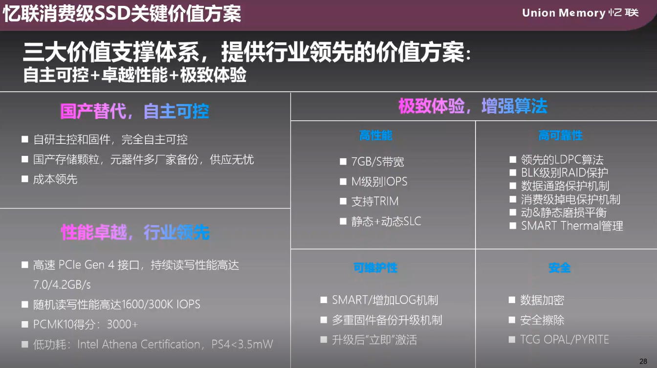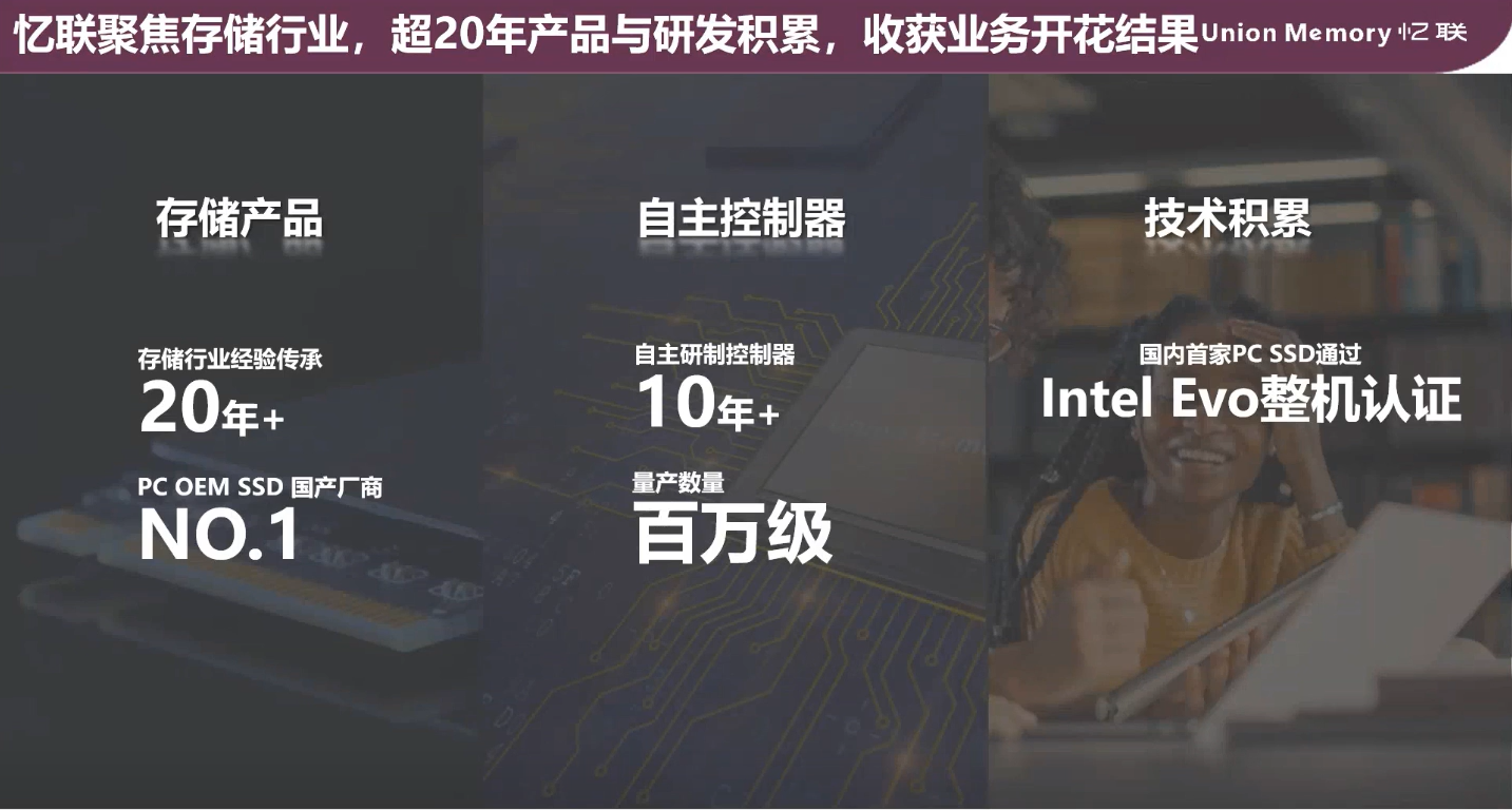 作为有着超20年产品研发经验的国产固态存储厂商,忆联有着面向全领域、全生态的固态硬盘解决方案,包括应用在企业级、云化数据中心的企业级固态硬盘,面向PC、高端游戏本、高端工作站的消费级固态硬盘,还有应用在车载、手机、智能穿戴中的嵌入式存储产品。其中消费级固态硬盘产品在PC SSD领域中占国产厂商第一名。此外,忆联还拥有自主控制器,经过10多年的升级与迭代,目前出货量已达百万级。